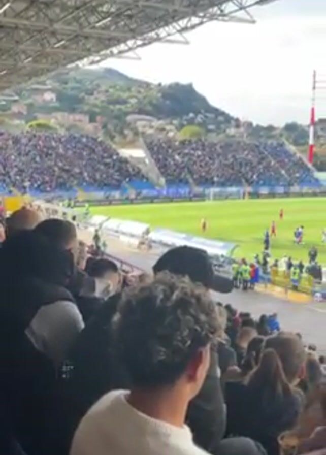The video captures a soccer match from the perspective of a spectator in the stands. The stadium is filled with fans, most wearing blue, and a clear view of the field shows players in red and blue jerseys competing. Several staff members are visible near the sideline. The stadium is covered by a metal roof. A tall, red and white tower stands in the background. The sky is partly cloudy, and buildings cover the hillside in the distance.