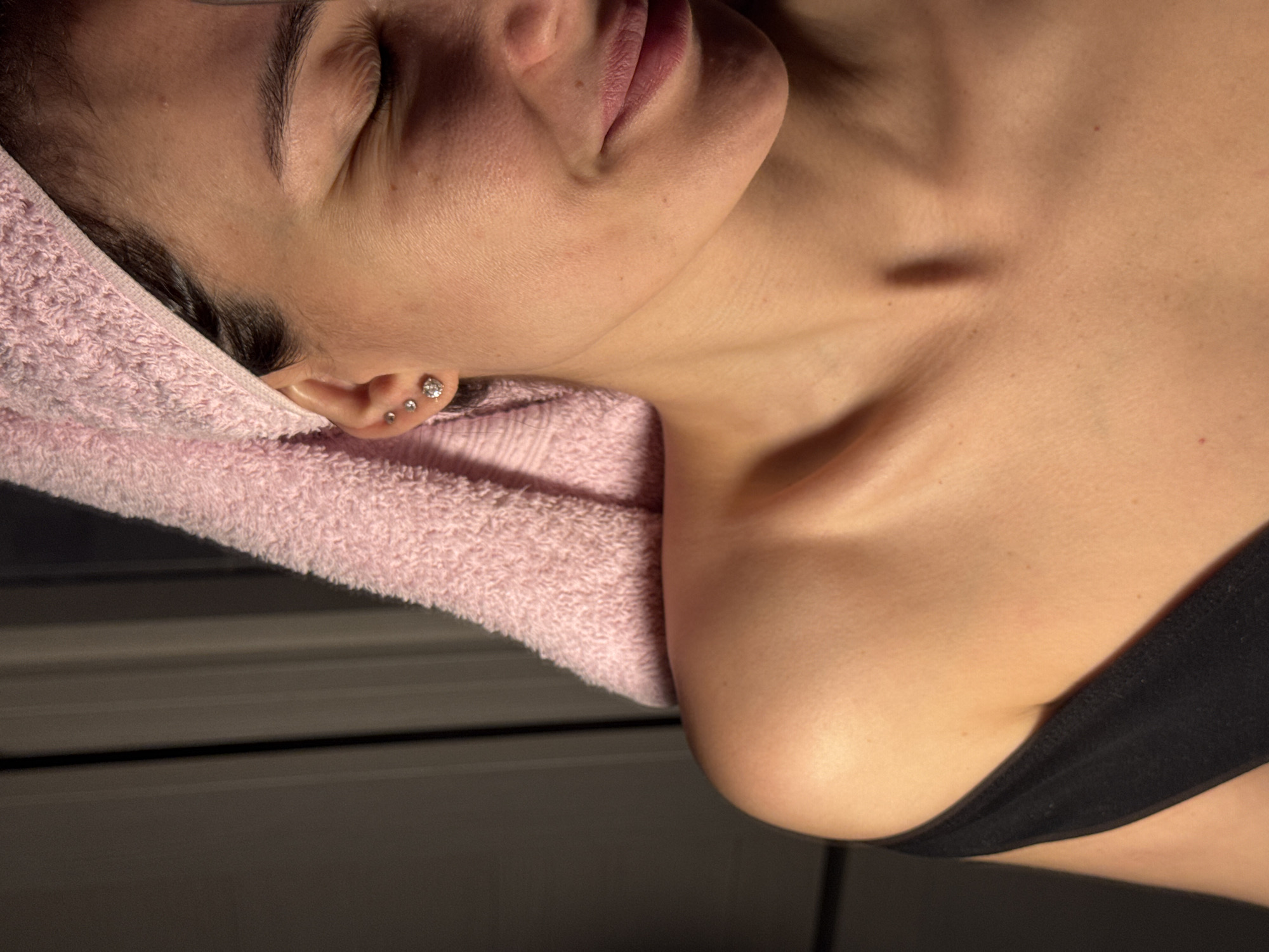 A close-up, overhead shot depicts a person lying down. A light pink towel is wrapped around their head. Their eyes are closed. The subject has several piercings in their left ear. Their skin is fair, and they are wearing a black garment on their right side. The background appears to be a neutral gray or dark. The specific location in the city of Chaikovsky, Russia, cannot be determined from the provided image.