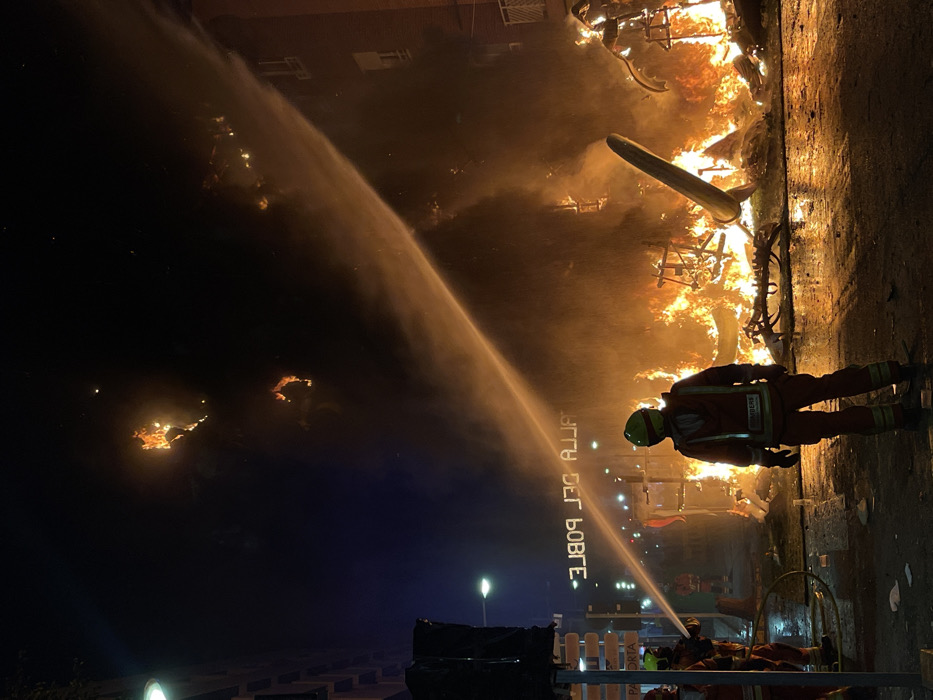 At night in Paiporta, Spain, a large Falla monument is intensely burning in the street, generating significant flames and smoke