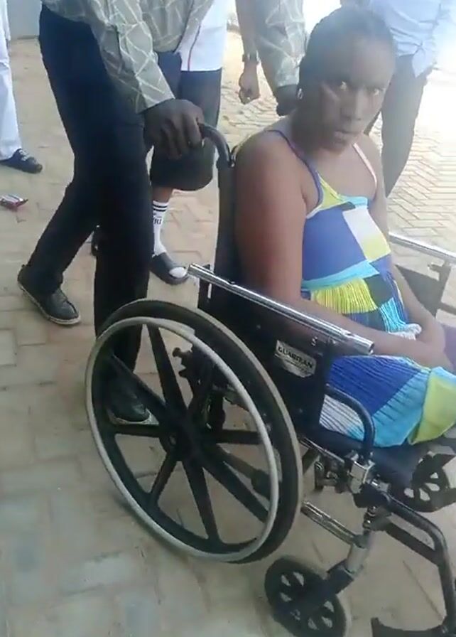 A man wearing a light-colored patterned shirt and black pants pushes a woman in a wheelchair along a brick walkway. The woman has bare feet and is wearing a blue and yellow sundress and purple leggings. There are other men standing nearby. The walkway is bordered by a gray concrete wall with a small patch of plants at its base. Barbed wire is visible at the top of the wall.