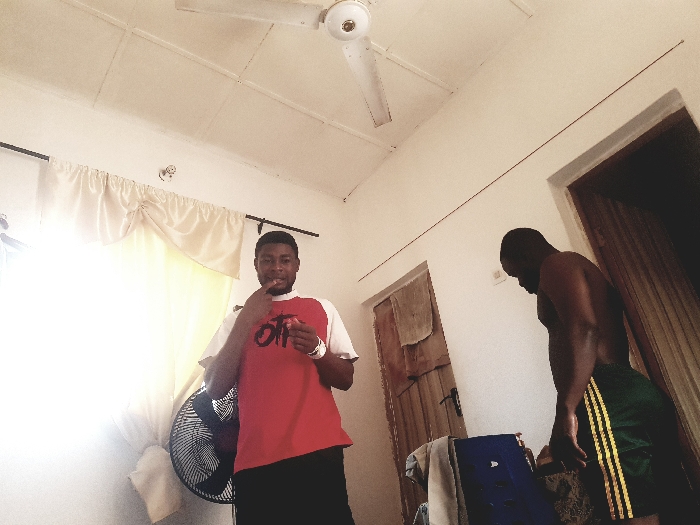 An interior scene within a room in Samaru, Nigeria, features two adult males. The primary subject, a light-skinned male, stands foreground-left, facing the camera. He wears a red t-shirt with white sleeves and dark trousers, with his right index finger touching his chin and a white wristband visible on his left wrist. To his right, a dark-skinned male, shirtless and wearing green athletic shorts with yellow stripes, is partially visible from the side, bending forward over an obscured object. The room has white, textured walls and a white paneled ceiling from which a three-bladed white ceiling fan is suspended. A bright window, partially obscured by light-colored, draped curtains, is visible on the left wall, near which a black oscillating fan is positioned. Two wooden doors are present: one to the left of the bending male has a piece of fabric draped over it, and another, further right, appears partially open. A blue object, possibly a container, rests on a surface in the foreground, draped with a light-colored fabric.