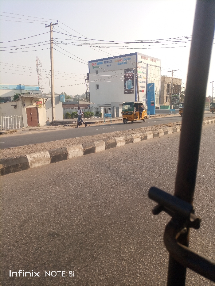 A daytime shot on a paved road features a yellow auto-rickshaw moving towards the right. A man is walking on the side of the road. Several buildings are visible in the background, including one with multiple advertisements. Utility poles and overhead wires are present. The image is partially obstructed by dark metallic bars, likely from the vehicle taking the picture. The watermark "Infinix NOTE 8i" is at the bottom left.