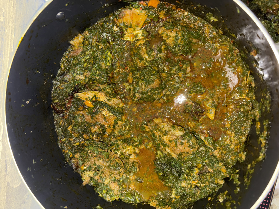 A top-down shot displays a black pot filled with a green, leafy stew. The stew appears thick and textured, with visible bits of meat and possibly vegetables mixed within the greens. There's a visible oily sheen and some darker reddish-brown liquid pooling on the surface. The pot's interior shows signs of food adhering to the sides, suggesting the stew has been simmering or cooked for a while.
