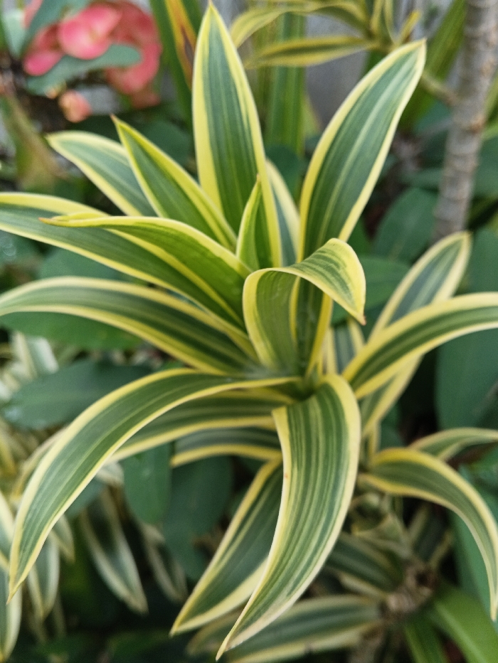 A vibrant plant displays elongated, lance-shaped leaves with striking variegation. Alternating stripes of deep green and bright yellow run lengthwise along the leaves, creating a bold visual pattern. The leaves radiate outwards from a central point, forming a dense, lush cluster. Hints of other green foliage and a red flowering plant are visible in the background, adding further depth to the scene. A textured stem appears on the right.
