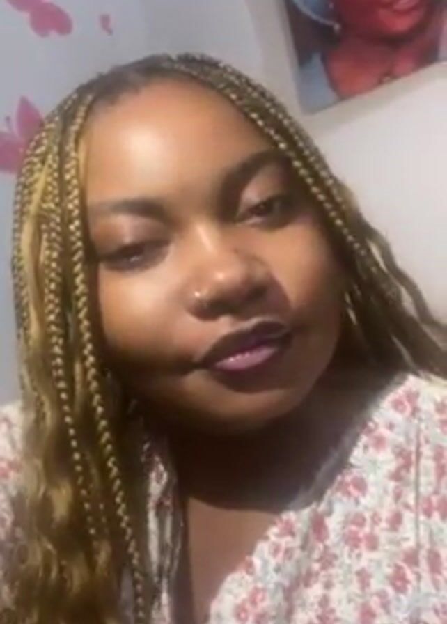 A young Black woman with light brown braids, a nose ring, and dark purple lipstick is looking at the camera. She is wearing a white floral patterned shirt. Behind her is a white wall decorated with pink butterfly stickers and a framed portrait of another Black woman wearing a light blue turban.