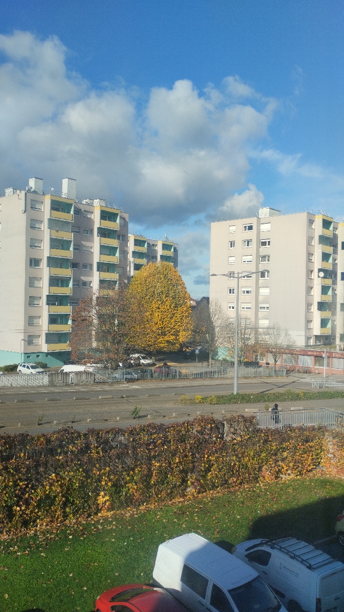 The image depicts an autumn daytime urban scene in Schiltigheim, France