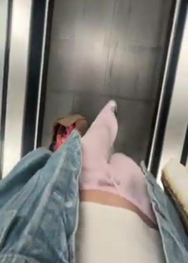 first-person perspective of someone riding an escalator. The person is wearing white pants, light pink sweatpants, and a denim jacket. There's a shopping bag on the escalator step to the left of them. The escalator is moving upwards, and the side walls are visible with black and white panels.