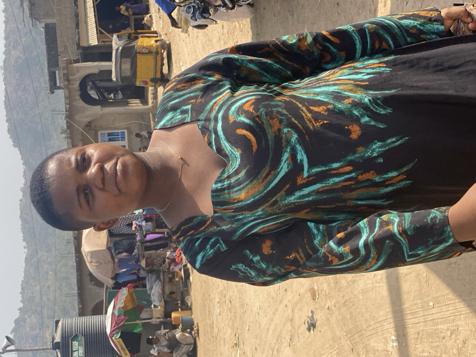 The image portrays a young adult female positioned centrally, directly facing the viewer with a neutral expression. She has short, dark, closely-cropped hair and wears a black, long-sleeved dress featuring an abstract pattern of teal and orange brushstrokes, with a distinctive sweetheart-shaped neckline and a thin gold necklace. The setting is an outdoor street or market within the city of Abobo, Nigeria. A black cylindrical water tank on the far left of the background prominently displays the inscription 'UMUNA YUSUF STREET.' The ground is composed of light brown packed earth, exhibiting visible tire indentations. In the mid-ground, multiple market stalls are visible under colorful umbrellas (green/pink, beige), displaying various goods, including textiles. Several indistinct individuals are present, some appearing as vendors or customers. Behind the market stalls, an assortment of structures line the street, including a light-colored building with an arched entrance and blue-framed windows. A yellow three-wheeled motorized rickshaw is parked on the right side of the thoroughfare. Distant hills or mountains are discernible under a bright, hazy sky.