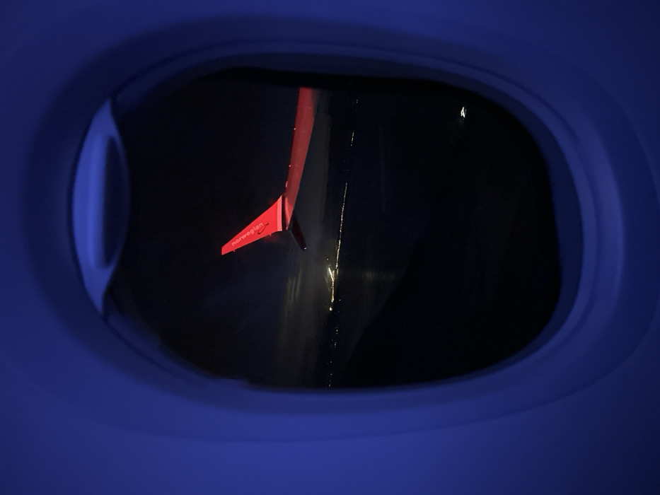 View from an airplane window at night. The red wing of a Norwegian Air Shuttle plane is visible, with the company's name printed on it. Streaks of light illuminate the darkness below, reflecting off the wing. The oval window frame is a deep blue. The surrounding environment outside the window is black, enhancing the contrast of the red wing and streaks of light.