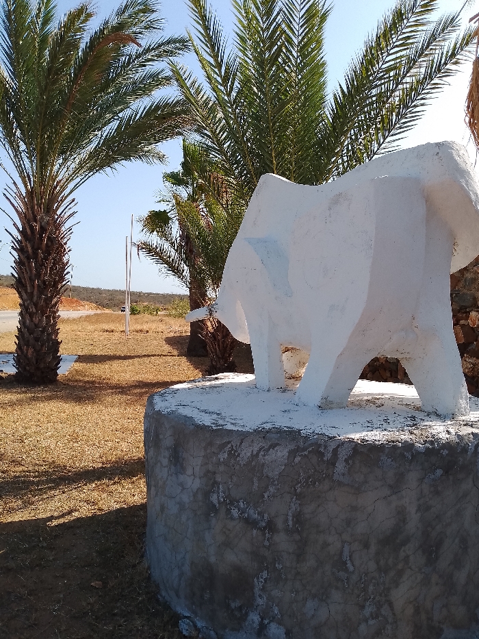 This image captures a scene in La Guardia, Venezuela, under clear daylight. The primary subject is a geometrically stylized white statue resembling a bull, positioned on a circular, weathered concrete pedestal in the right foreground. The statue's right flank is prominently featured, with its head facing towards the left. Immediately behind the statue and extending to the left are several date palm trees with green fronds. The ground throughout the scene is covered in dry, light brown grass and dirt, exhibiting distinct shadows from the trees and statue. In the mid-ground, a paved road is visible, on which a small, light-colored vehicle is present. Two vertical, slender poles stand adjacent to the road. The background consists of a low, arid landscape under a bright, cloudless blue sky. No human figures are present.