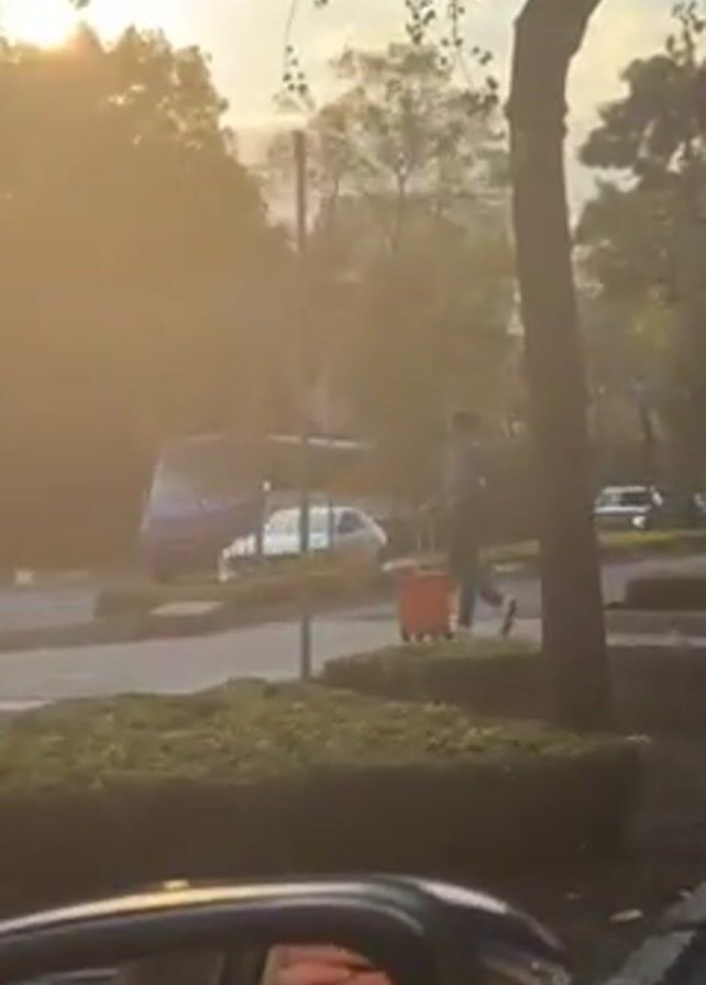 man walking on the sidewalk next to a busy road with a red rolling suitcase and a travel pillow on top of the suitcase. He has a backpack on. He is wearing a striped shirt, dark pants, and white shoes. As he walks, he pulls the suitcase. A bus and several cars are visible driving on the road. The sun is shining. The video is taken from inside of a vehicle, and the side mirror is visible in the bottom left corner of the frame.