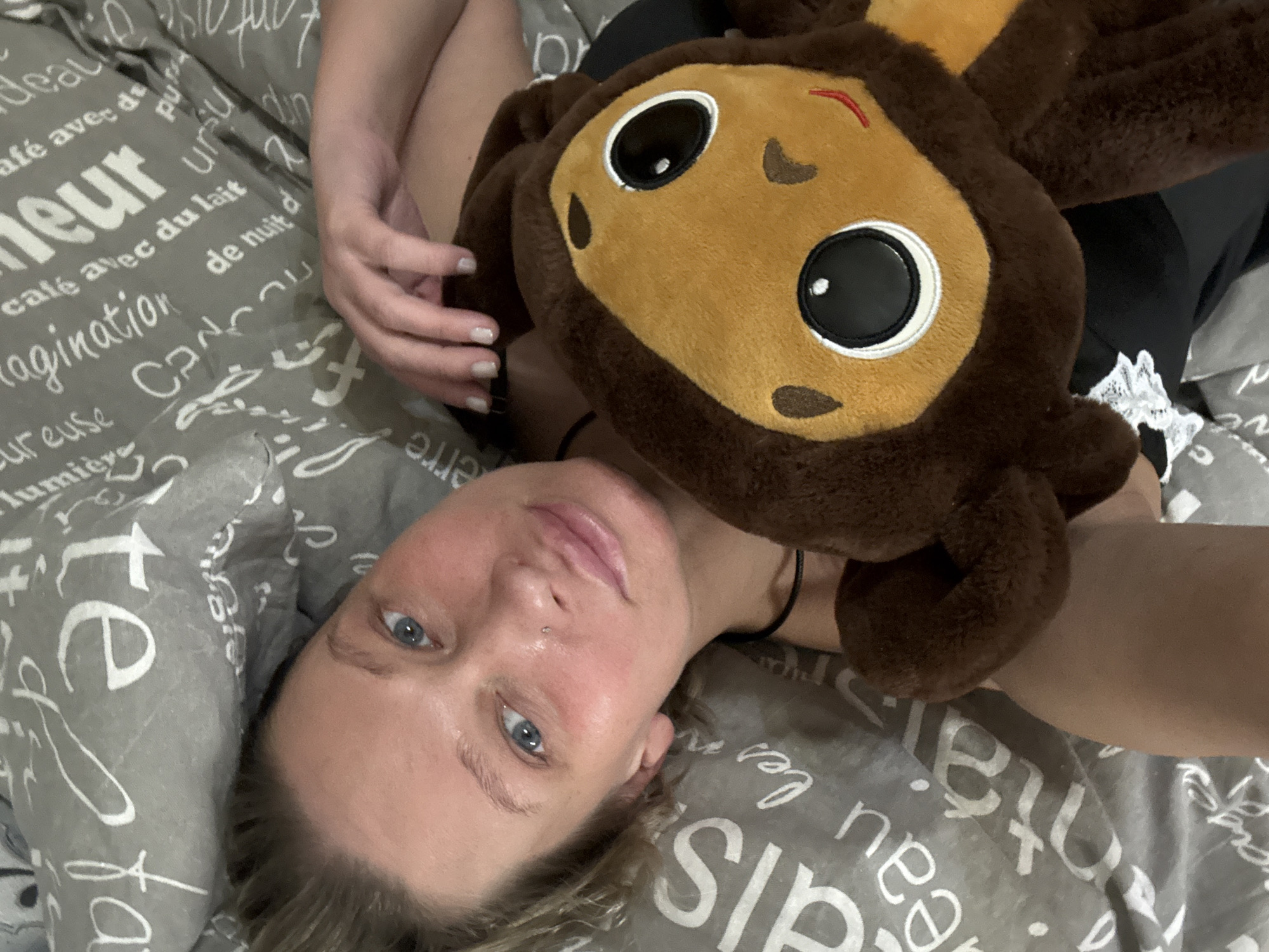 A Caucasian woman with fair skin and blue eyes lies on a grey bedspread printed with French text. Her head is tilted towards the left side of the frame, and she has a small nose piercing. A brown plush toy with large, cartoonish eyes rests on her chest and shoulders. Her left hand is visible near the top of the toy, fingers gently curled. The environment appears to be an indoor, domestic setting. There's no indication of being located in Perm, Russia.