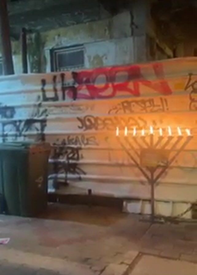 lit menorah standing on a sidewalk in front of a metal barrier covered in graffiti