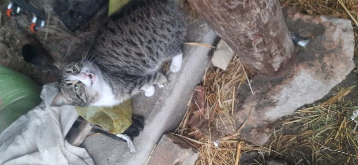 - "A gray and white tabby cat rests on a concrete slab surrounded by straw, debris, and a cylindrical wooden object" by FM-0zE9q2, licensed under CC BY 4.0