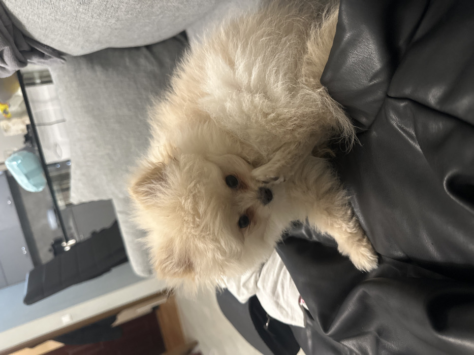 - "A light-cream colored Pomeranian dog, facing forward, is positioned on a dark, possibly leather, surface" by FM-Nojfz2, licensed under CC BY 4.0