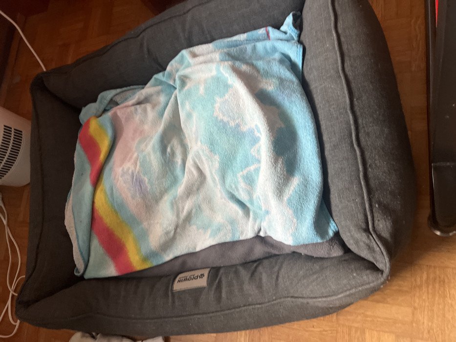 - "The scene depicts a dark grey, fabric pet bed situated on a light brown wooden parquet floor" by FM-6KpGb2, licensed under CC BY 4.0