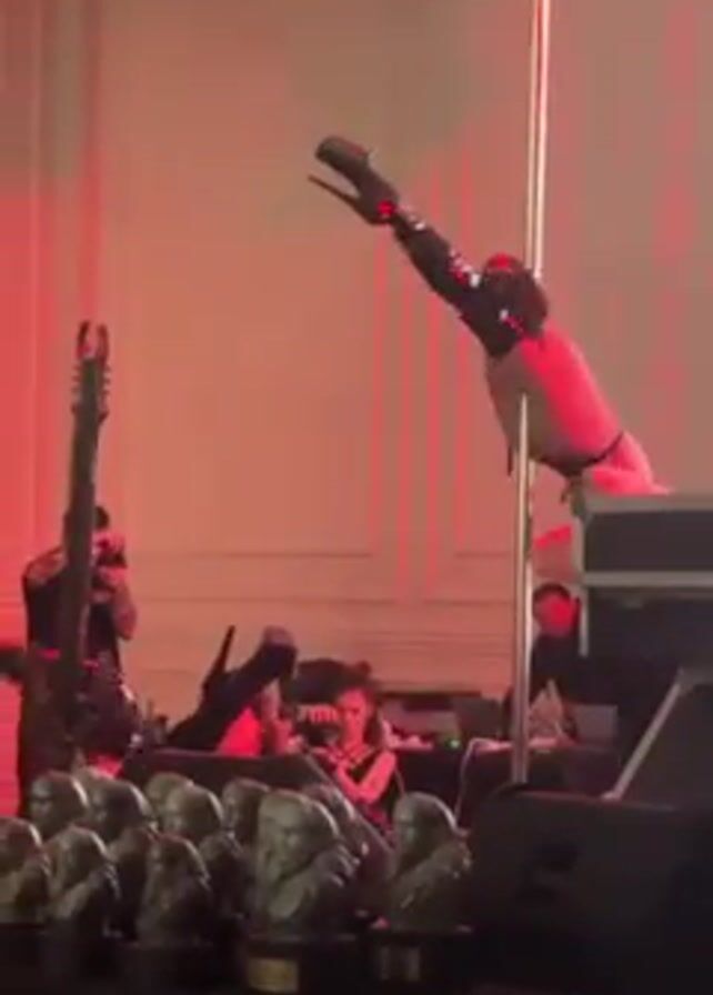 woman in black lingerie and tall black boots performing on a pole in front of a band. The band members, including a guitarist, are visible behind a row of statuettes. A woman sits near the band, taking pictures with her camera. The lighting in the room is mainly red. The woman on the pole performs various acrobatic moves.