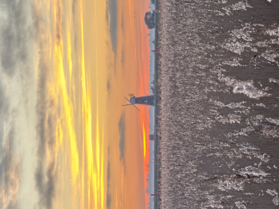This image captures a wide rural landscape at sunrise or sunset, centered on St. Olaves Drainage Mill, located near the town of St. Olaves, southwest of Great Yarmouth, within the Broads National Park, United Kingdom. The foreground is dominated by a dense field of tall, dried reeds or marsh grass, predominantly light brown and greyish-white with feathery plumes, which occupy approximately the lower two-thirds of the frame. These reeds appear illuminated by the low-angle light. In the midground, silhouetted against a bright horizon, stands the St. Olaves Drainage Mill, a dark, four-sailed brick tower windmill. To the left of the mill, a dark-colored vehicle is visible in the distant landscape, alongside a vertical red marker post. Further to the right of the mill, a solitary dark deciduous tree with a rounded canopy is visible on the hazy horizon line. The horizon itself presents a band of intense orange-red light, indicating the sun's position just below the visible frame. The sky, occupying the upper third of the image, transitions from the vibrant orange-red at the horizon to warm yellow hues, then fading into pale grey-blue towards the top. Horizontal bands of clouds are present across the sky. A faint, thin white contrail from an aircraft is discernable in the upper right quadrant. No individuals or active subjects are present in the scene.