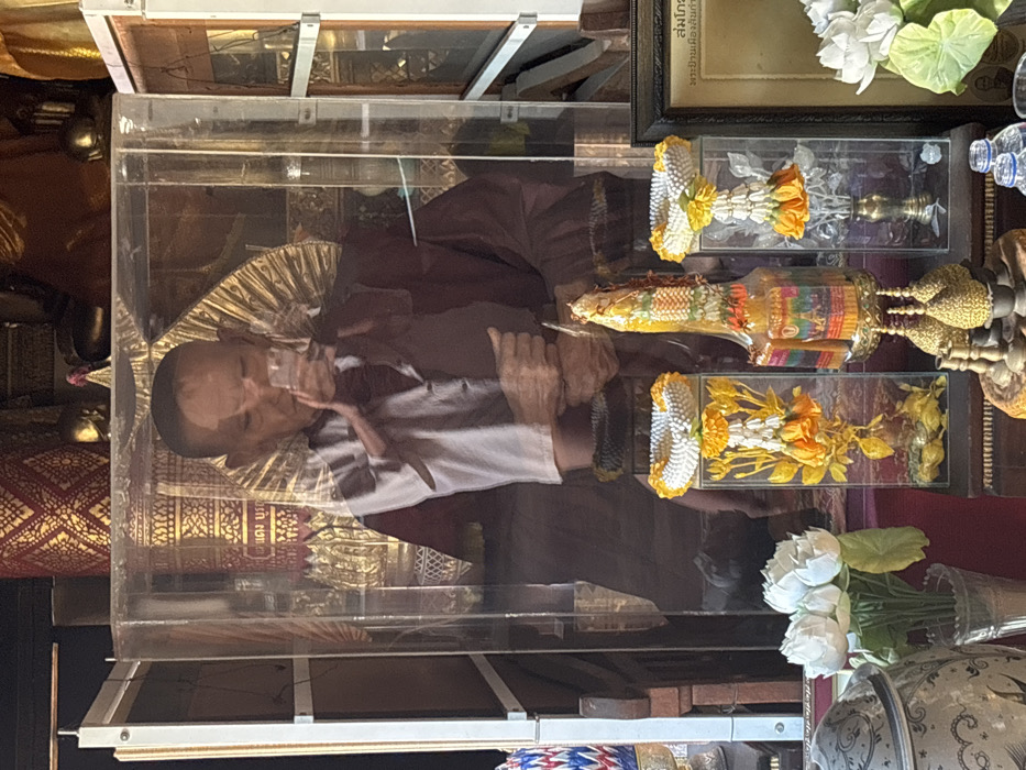 - "This image depicts the preserved body of a venerated bald Buddhist monk, identified as Luang Pu Khamphan, seated upright in a meditation posture within a clear rectangular acrylic display case" by FM-wUaYc2, licensed under CC BY 4.0
