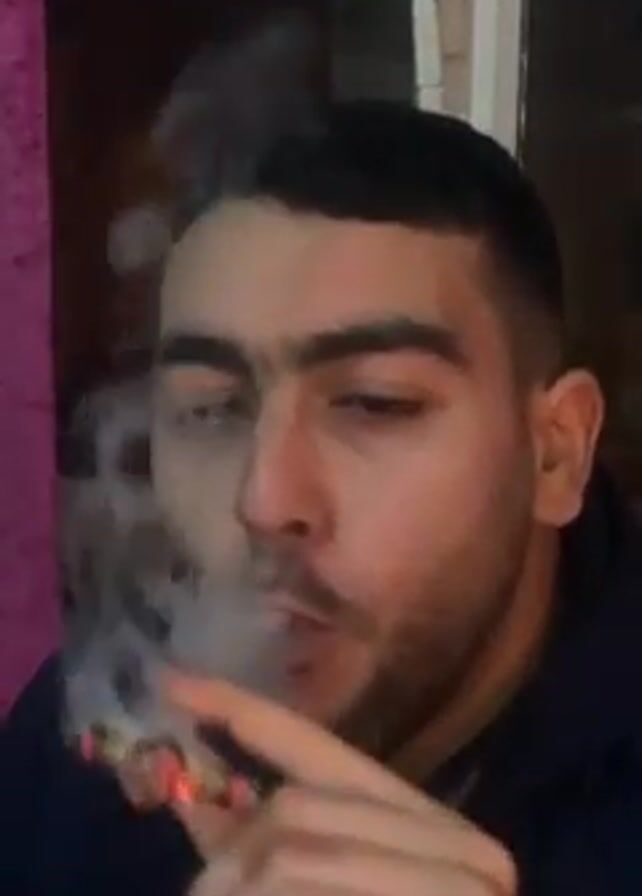 A man with dark hair and a trimmed beard, wearing a dark blue jacket, is holding a lit cigarette and exhaling smoke. The background includes a pink curtain and a window. The music plays audibly throughout.