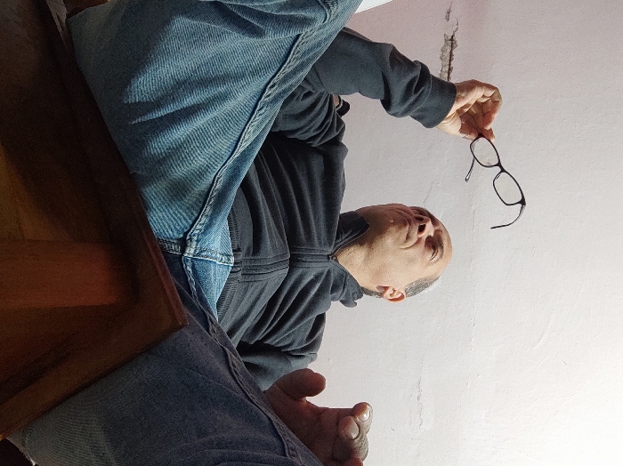A man sits in a chair, facing upwards. He is wearing jeans and a dark jacket. He holds a pair of glasses in his right hand, slightly above his head. The background is a plain white wall with a crack. The image is taken from a low angle, looking upwards at the man. A portion of the wooden chair is visible on the left side.