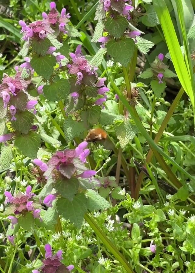close-up of green plants with purple flowers in a grassy area. An insect, possibly a bee or hoverfly, briefly flies around the flowers before moving out of frame. The plants are surrounded by other greenery, including grass and small white flowers. The lighting suggests it is daytime, possibly outdoors.