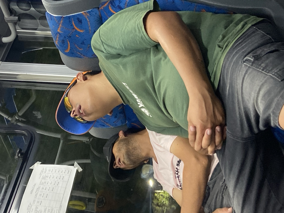 The image depicts the interior of a public transport vehicle, likely a bus, at night or in low-light conditions. Two adult males are seated, both appearing to be asleep or resting with their heads tilted back. The individual in the foreground is a male with a medium skin tone, wearing a blue and orange baseball cap, mirrored sunglasses, a green short-sleeved t-shirt with a white logo (partially legible as "YAMAH" or similar), and dark wash denim shorts. His hands are clasped together in his lap. He occupies a blue seat with an orange abstract pattern. To his left, partially obscured, is another male with a medium skin tone and facial hair. He is wearing a black baseball cap and a light pink short-sleeved t-shirt. His arms are crossed, and he is also leaning back with his head tilted. Through the window on the left, a dark, blurred exterior is visible, suggesting an urban or suburban environment at night, with faint artificial light sources. A white piece of paper, possibly a fare schedule or information sheet, is taped to the window glass. The top of the paper displays "LINEA H" and contains a table with columns of numerical values (e.g., "494.83", "99.27", "882.4"), indicative of fare prices or similar data. Overhead handrails typical of public transit vehicles are visible. The environment is consistent with public transportation in the Buenos Aires metropolitan area, which includes Villa Domínico, Argentina. However, the exact location or street within Villa Domínico is not discernible from the provided image.