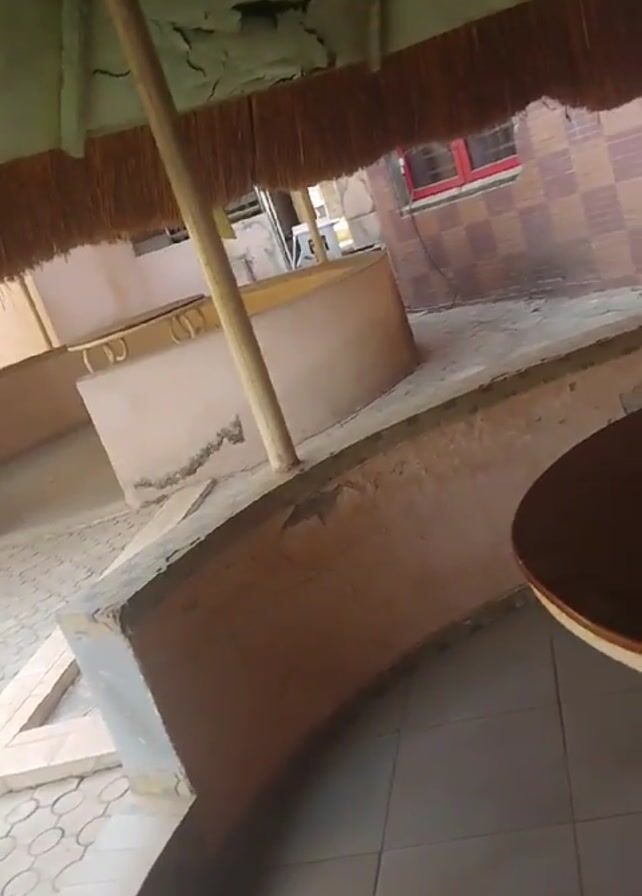 scene under a thatched roof structure, possibly a gazebo or covered patio