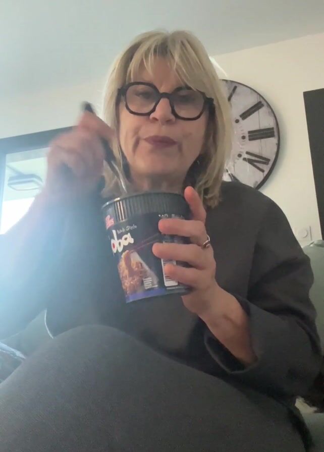 A blonde-haired woman wearing glasses is sitting indoors, seemingly on a couch. She is holding and eating from a cup of instant noodles using a fork. A clock is visible on the wall behind her. She appears to be the sole focus of the video.