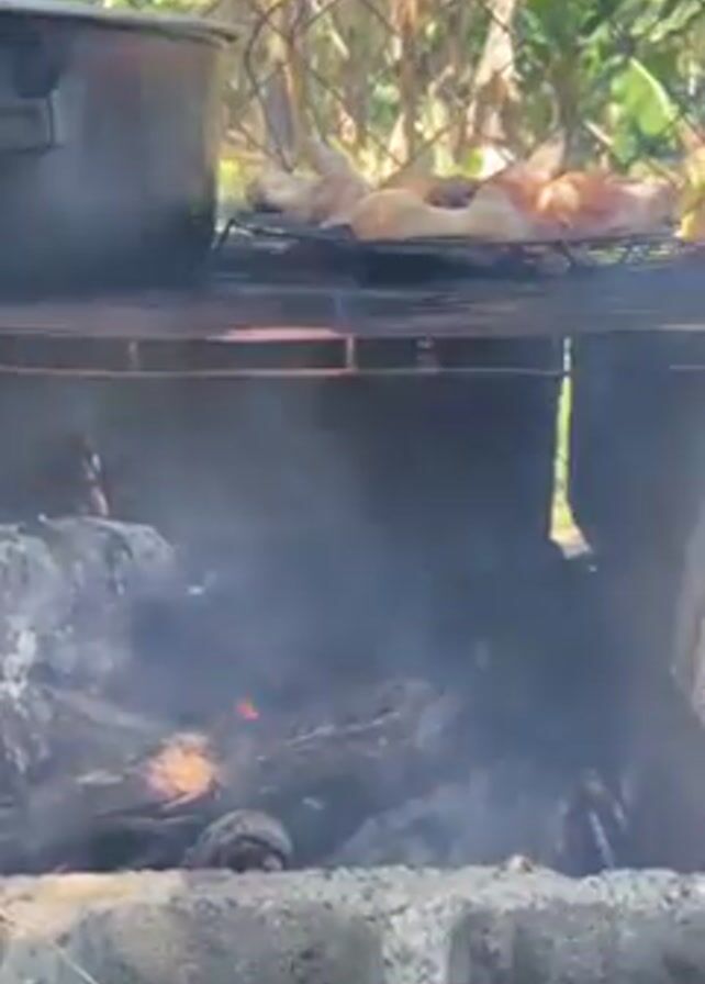 n outdoor cooking setup. A black pot sits on the left side of a metal grill. Several raw chicken legs are arranged on the right side of the grill. Below the grill, a fire burns inside a square structure built from gray cinder blocks. The fire is made of logs, and smoke rises from it. A chain-link fence is visible in the background, with green vegetation beyond it. The scene appears to be set outdoors during the daytime.