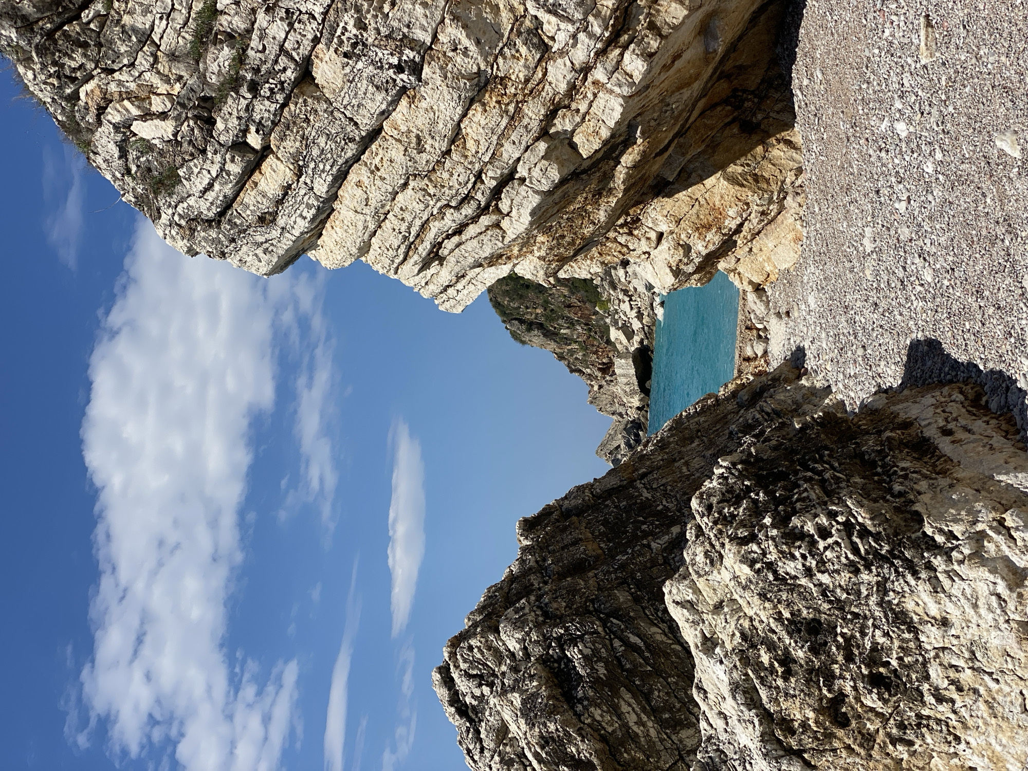 The image, taken in Mirište, Montenegro, features a view of the sky and sea framed by rocky cliffs. The sky is a bright blue with streaks of white clouds. The sea is a turquoise color, visible through a natural opening in the rocks. The cliffs are made of layered rock formations, displaying variations in texture and color. On the right side of the image, there is a visible stretch of shoreline with gravel or small rocks. The photograph is oriented in a way that the horizon is tilted.