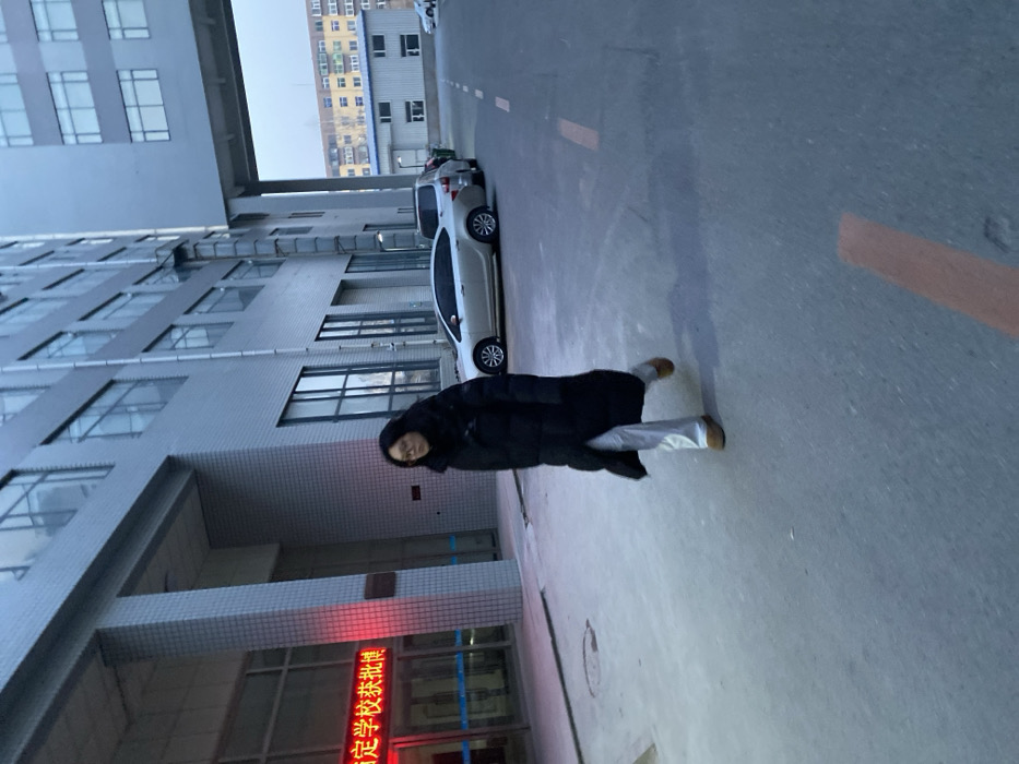The image captures an outdoor scene in Zhongtun, China, under diffuse, cool lighting indicative of dusk or dawn. A female individual, appearing approximately 20-40 years old, with long dark hair and eyeglasses, is depicted walking from left to right across a paved asphalt or concrete surface. She is dressed in a long, dark (likely black) puffer coat that extends below her knees, light-colored (possibly white or silver) wide-leg pants, and tan slip-on shoes, with her left foot raised mid-stride. To the subject's left is a multi-story modern building featuring a light gray, tiled facade and numerous large, rectangular windows. Its ground level includes a recessed entrance area supported by columns, above which a red illuminated sign displays partial Chinese characters reading "定学校批博". To the subject's right, a paved lane runs parallel to the building, bordered by faded orange markings. Several vehicles are parked along this lane, including a silver sedan and a silver SUV/van. Further down the lane, another multi-story building, stylistically similar, connects to a structure in the distance via an elevated walkway. In the background, beyond these structures, a collection of residential-style multi-story buildings in various muted colors and a corrugated metal building are visible against a hazy sky. A circular manhole cover is present on the paved ground in the lower-left foreground.