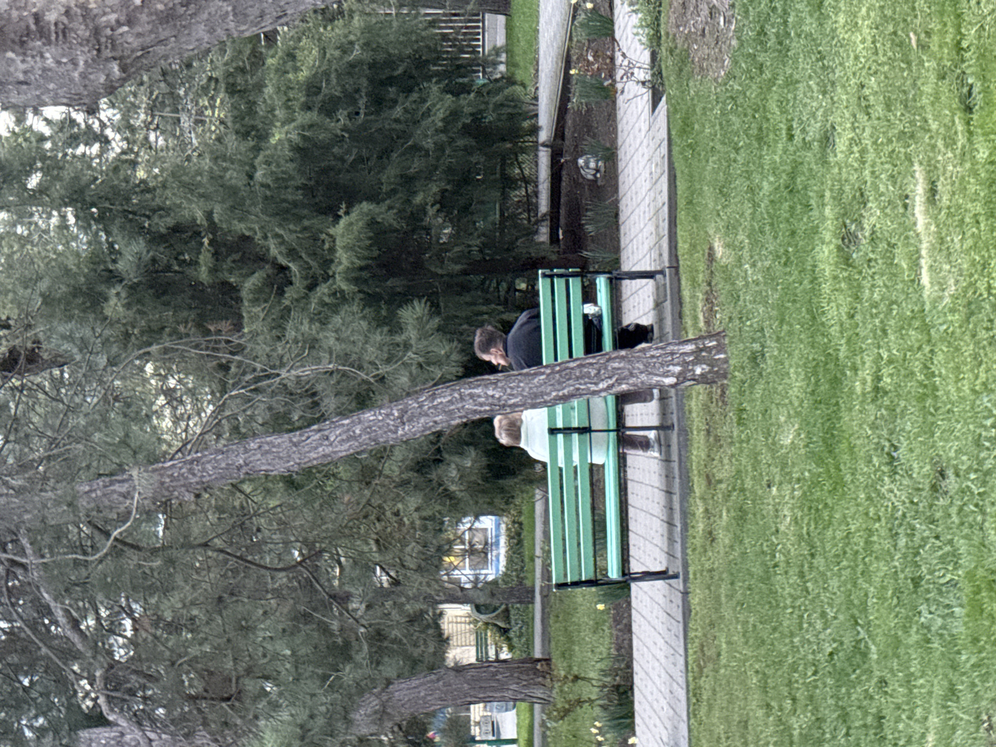 Two individuals are seated on a green bench within a park setting