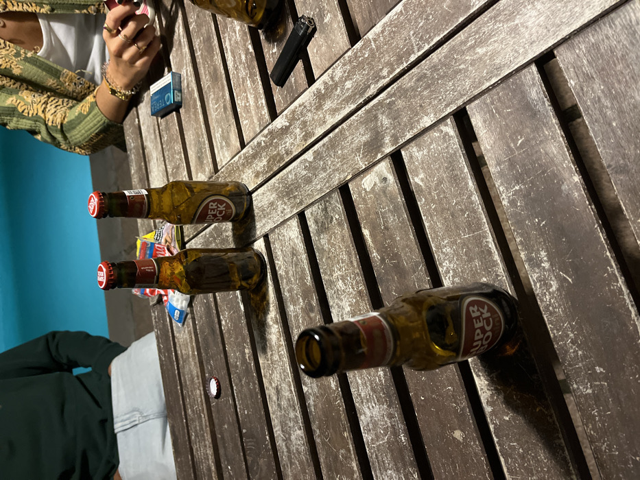 An outdoor night scene in Ponte de Lima, Portugal, features a weathered wooden slatted table positioned alongside a vibrant blue swimming pool. Two individuals are partially visible, seated at the table. The person on the left wears a dark green long-sleeved shirt and light-wash jeans, with hands in pockets. The person on the right wears a patterned green, yellow, and brown long-sleeved shirt over a white top, adorned with multiple rings and bracelets, and is actively engaging with a small white object with their right hand. Arranged on the table are four brown glass Super Bock beer bottles. One bottle in the foreground is empty with its red cap removed. Two additional bottles, partially full with red caps, stand further back. A fourth bottle is partially visible on the far right. A single red bottle cap rests on the table. Two crumpled snack wrappers, one predominantly red, white, and blue, and another yellow, are located near the capped bottles. A light blue and white TEREA cigarette pack and a black cylindrical lighter are also present on the right side of the table.