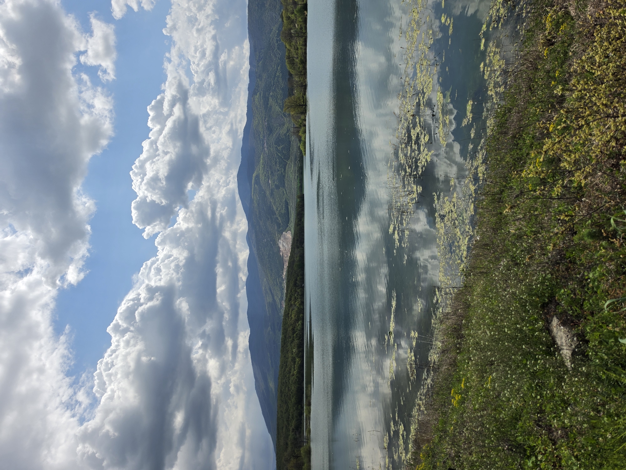 The image depicts a landscape in Muldava, Bulgaria. A body of water occupies the center of the scene, with a mountain range in the background. The sky is filled with cumulus clouds. Vegetation is present on the right bank of the body of water, featuring green grass and yellow flowers. The water's surface reflects the sky.