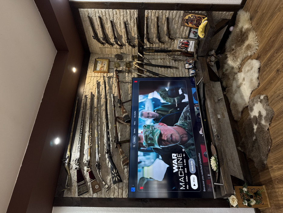 This image depicts a corner interior of a room in a residence located in the city of Razlog, Bulgaria. The walls are finished with light-colored, stacked stone veneer, contrasting with a dark brown ceiling border and white ceiling containing two recessed spotlights. The floor is covered with warm-toned wooden laminate or planks. A large, modern flat-screen television is centrally positioned on a rustic, thick wooden entertainment stand. The television displays the Netflix interface, specifically the details for the movie "War Machine," featuring a close-up of an actor in a military uniform with a "RANGER" cap. The walls are extensively decorated with antique weapons. On the left wall, at least seven long guns, appearing to be flintlock or percussion rifles/muskets with ornate stocks, are horizontally mounted. The right wall displays at least five antique pistols vertically arranged. Several swords and daggers in scabbards are suspended vertically from the corner where the two walls meet. A small, framed landscape painting hangs on the right wall above the pistols. On the wooden stand, from left to right, are a dark decorative bowl holding a white artificial lotus flower, several framed photographs, a small calendar or picture, and a religious icon with a gold-colored background. A yellow plush banana toy rests near the icon. The floor in front of the stand is partially covered by three irregular-shaped animal hide rugs, appearing to be sheepskins, in varying shades of brown, white, and spotted patterns. A small wooden stand with artificial white roses is visible on the floor to the far left. No individuals are present in the immediate scene.