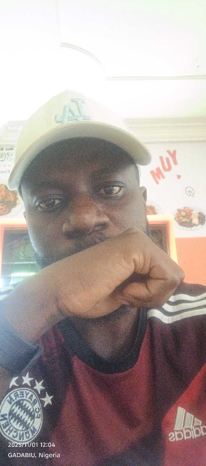 A dark-skinned adult male is depicted in a close-up, indoor, selfie-style photograph taken on 2025/11/01 at 12:04 in Gadabiu, Nigeria