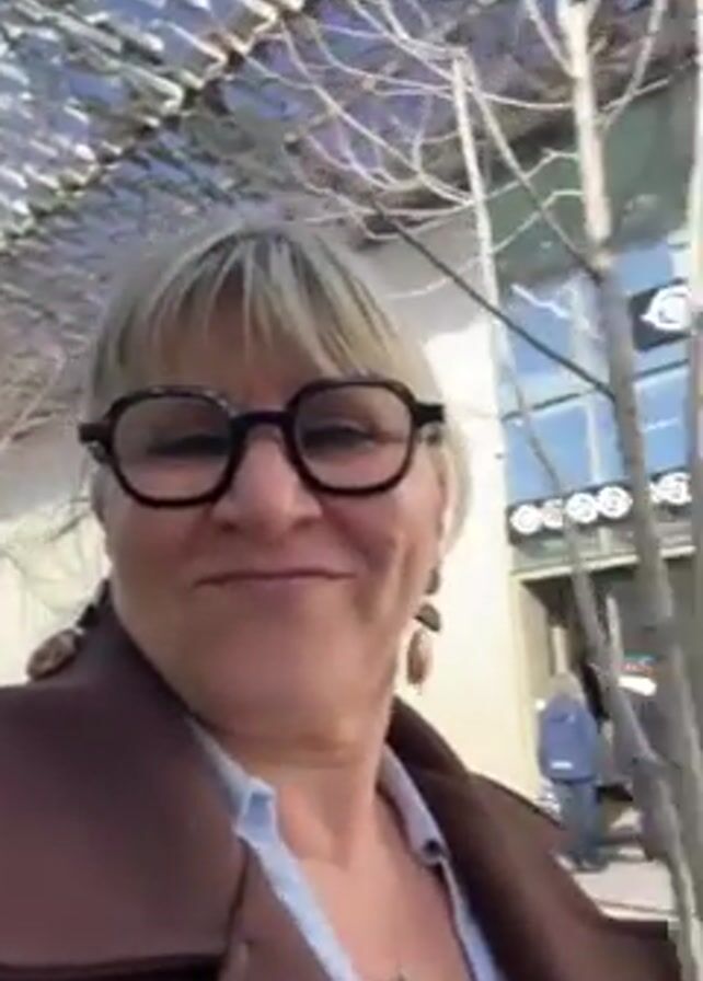 A woman with blonde hair and black-framed glasses is recording a selfie video. She is wearing a brown coat over a blue collared shirt and a silver necklace. Behind her is a modern, open-air structure with a lattice-like roof. A clothing store is visible in the background, featuring mannequins in the display windows. A person wearing a blue jacket walks by in the background. The woman maintains a direct gaze at the camera with a slight smile.