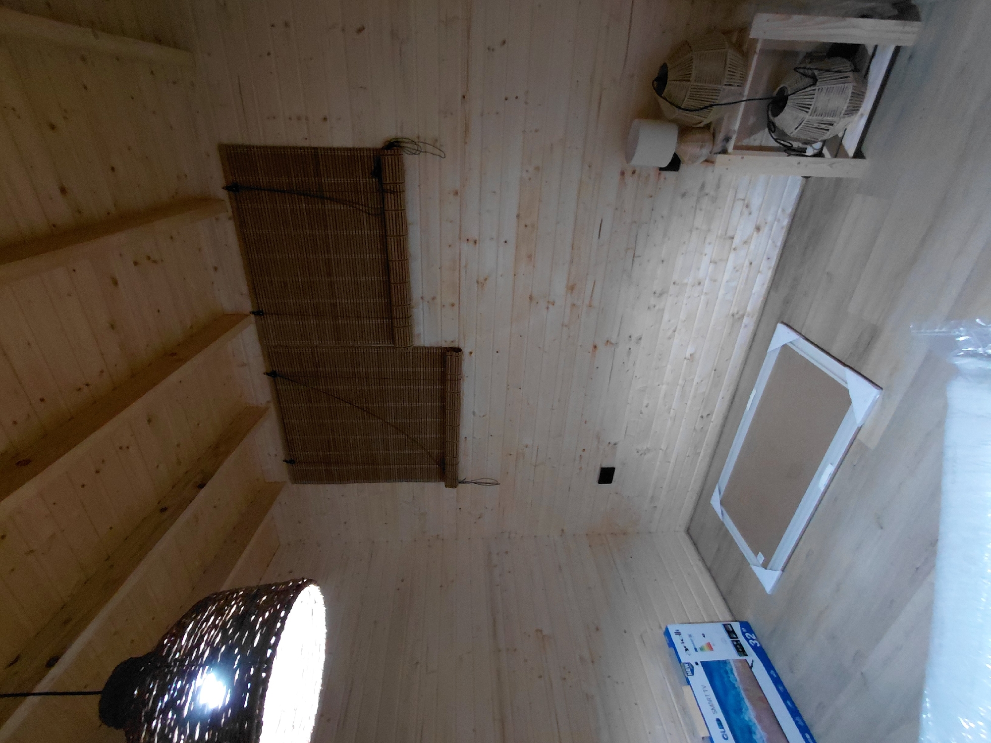 The image depicts an interior space, likely a room with wooden plank walls and a ceiling with exposed beams