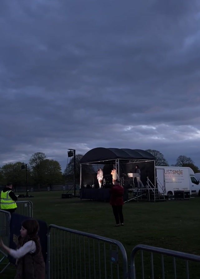 A band performs on an outdoor stage on a cloudy evening. The stage is set up in a grassy area, with trees visible in the background. A white van with the text "JUSTSMILE" is parked next to the stage. Several people are standing in front of the stage, watching the performance. A girl in a vest and jeans stands near a metal barrier to the left of the frame. She is looking at something off-screen. A man wearing a yellow vest stands nearby. A second individual wearing a burgundy colored shirt stands directly in front of the stage. The sky is filled with dark, heavy clouds.