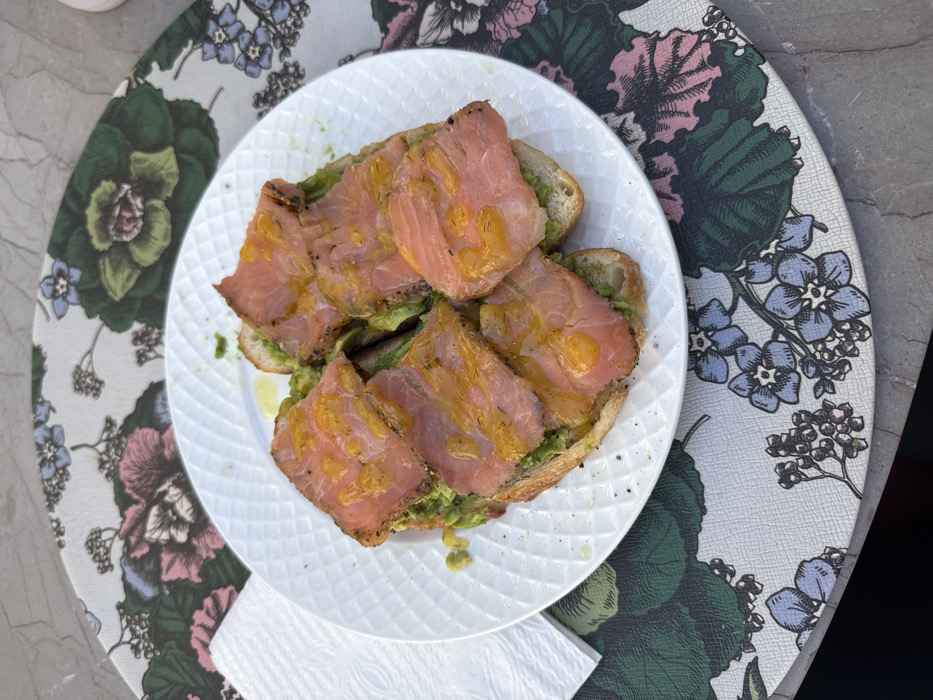 A plate of avocado toast topped with smoked salmon and drizzled with olive oil sits on a floral placemat