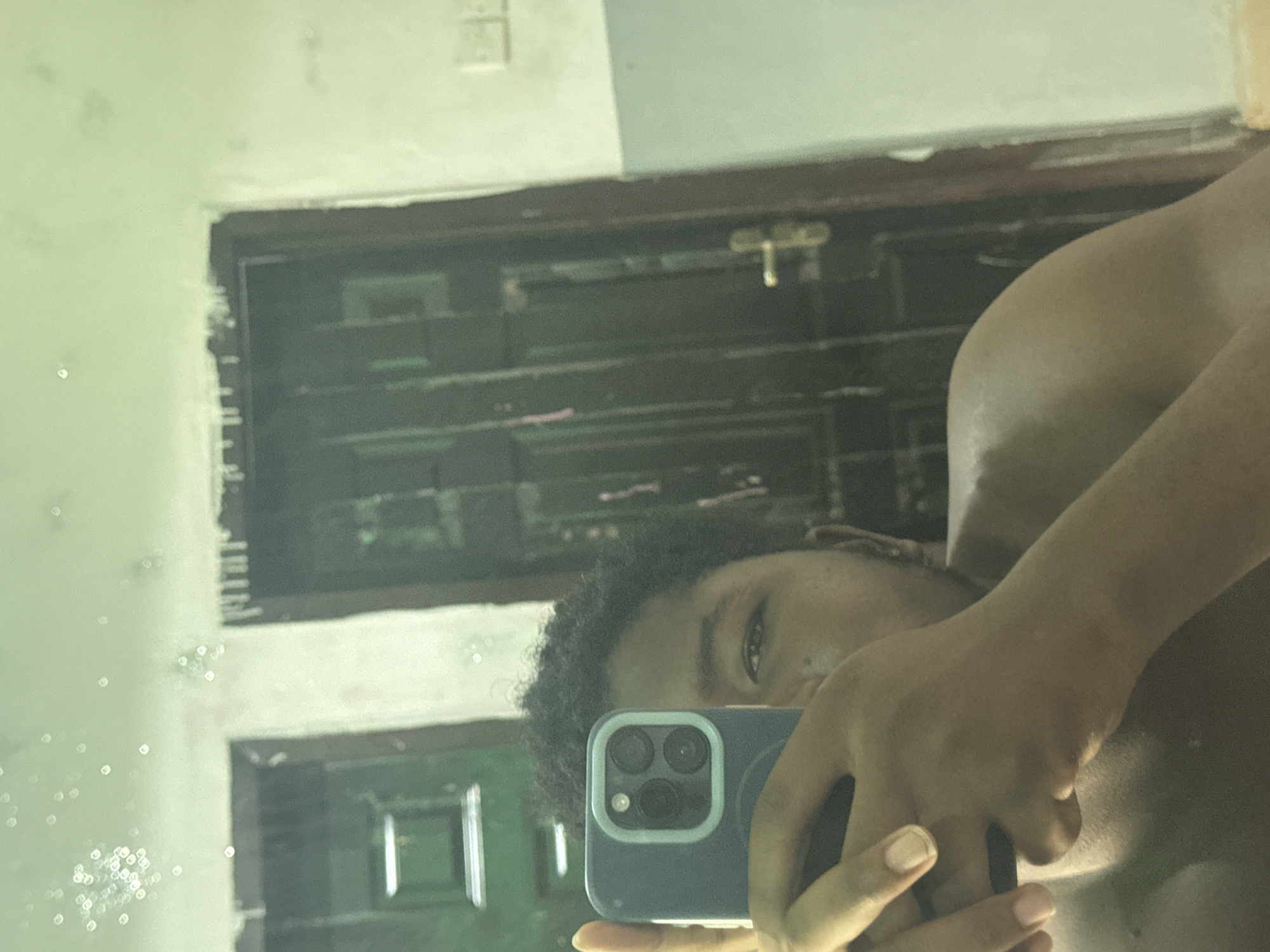 A person is taking a selfie in a mirror. The person has dark skin, short curly hair, and is holding a blue smartphone in front of their face. The mirror reflects a door with multiple panels and a silver handle. The background appears to be an interior room with white walls. It's impossible to confirm the location in Ipetumodu, Nigeria with just this image.