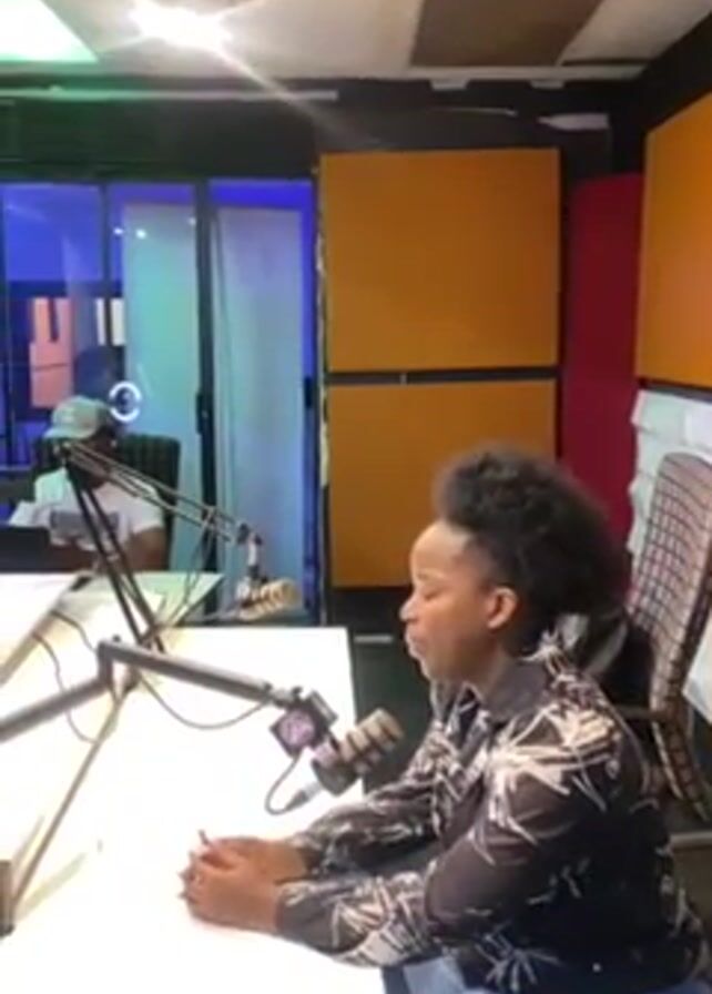 person, a woman with dark, curly hair, wearing a patterned black and white shirt with blue jeans, sitting at a white desk in what appears to be a radio studio. She is speaking into a microphone. In the background, another person, presumed to be male, wearing a white T-shirt and a baseball cap, sits at another desk with a microphone and computer monitors. The room has a colorful ceiling and various acoustic panels on the walls. A sign reading SAUMA HD RADIO is visible on a blue screen. The woman at the desk is holding a phone, presumably reading from it. The camera pans to give a wider view of the room and the two people.