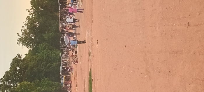 An outdoor market scene shows people walking and vendors selling under canopies. The market is situated alongside a tree line. The foreground is an expanse of red-brown dirt, marked with tire tracks. The sky is overcast, casting a diffused light over the scene. The market appears active, with numerous figures visible despite the image's perspective.