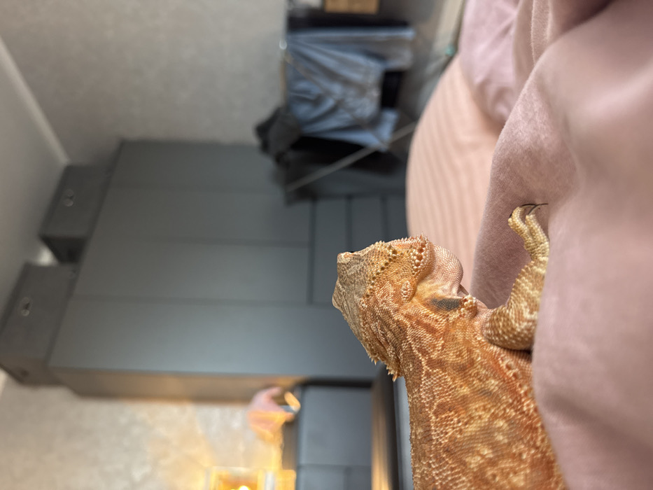 An adult orange and tan bearded dragon rests on a pink, textured fabric surface, positioned in the foreground of an indoor scene in Yakhroma, Russia