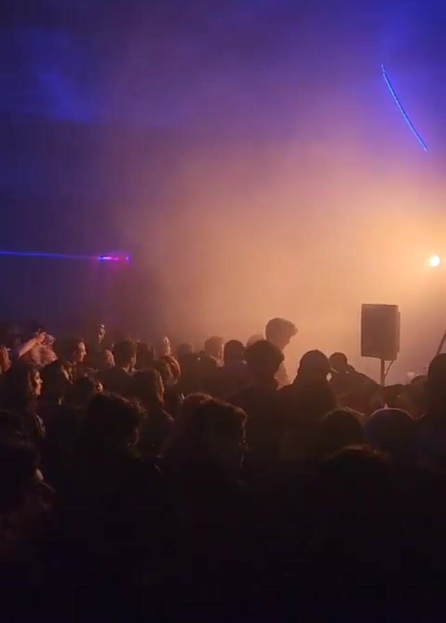 dark concert venue filled with a crowd of people facing the stage. The stage is obscured by orange and blue lighting and fog. Some people in the crowd are holding up their phones. There's a speaker and microphone stand visible on the stage. Blue laser beams are sweeping across the ceiling. The atmosphere is energetic and lively.
