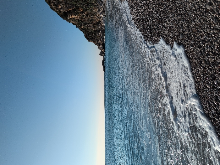 The image displays a coastal scene at Mirište, Montenegro, characterized by a clear, light blue sky occupying the upper two-thirds of the frame. A distinct horizon line separates the sky from the calm, blue-green sea. The sea exhibits gentle waves with white foam receding along a dark, coarse pebble beach, which fills the lower portion of the image and extends from the foreground towards the background on the right. To the right, a steep, rugged cliff face, heavily covered with dark green vegetation, descends into the sea. Several smaller rock formations are visible in the water at the base of this cliff. No individuals, animals, or man-made structures are present in the scene.