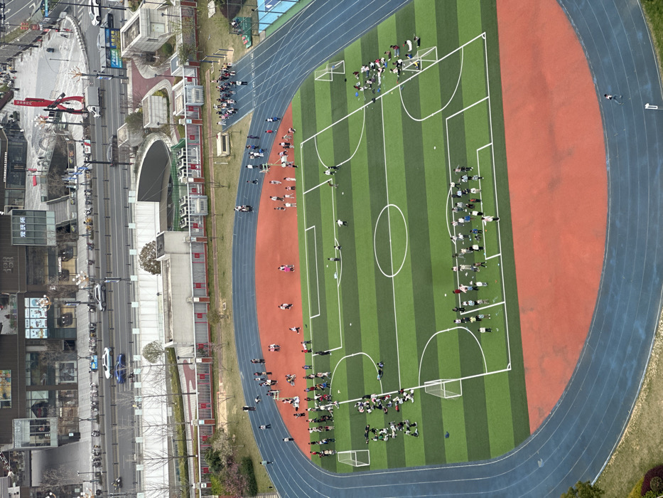 This image presents a high-angle, overhead view of a sports complex and adjacent urban infrastructure in Yiwu, China. The central feature is an oval-shaped sports ground. It comprises a blue, multi-lane running track that encircles an orange-red infield. Within this infield is a rectangular football pitch, featuring artificial turf with alternating light and dark green stripes. The pitch is clearly marked with white lines delineating two full-sized football fields, including center circles, penalty areas, and goal boxes. Four white metal goal frames are positioned at the ends of these fields. Approximately 100-150 individuals, primarily children or young students, are distributed across the sports ground. Large groups are gathered at both ends of the football pitch; some are standing in structured formations, while others are seated or lying on the turf. Smaller clusters and individual figures are scattered across the field, some appearing to be in motion. Several individuals are also walking or jogging on the blue running track and the orange-red infield. The sports complex is bordered by a white and red fence. Beyond this fence, a wide, multi-lane asphalt road runs parallel to the complex. Vehicles, including several cars and a white truck, are in motion on the road. Pedestrians are visible on the sidewalks flanking the road. Adjacent to the road, a complex of modern multi-story commercial buildings is visible. Prominent signage on these buildings displays Chinese characters for "华为" (Huawei), "星巴克咖啡" (Starbucks Coffee), and "爱买家" (Aimaieja/Aimajia). A large, red, abstract sculptural element is situated near these buildings. The scene is illuminated by overcast daylight, producing soft, diffused light and minimal shadows. Sparse trees with bare branches and landscaped greenery are present around the perimeter of the sports complex and along the road.