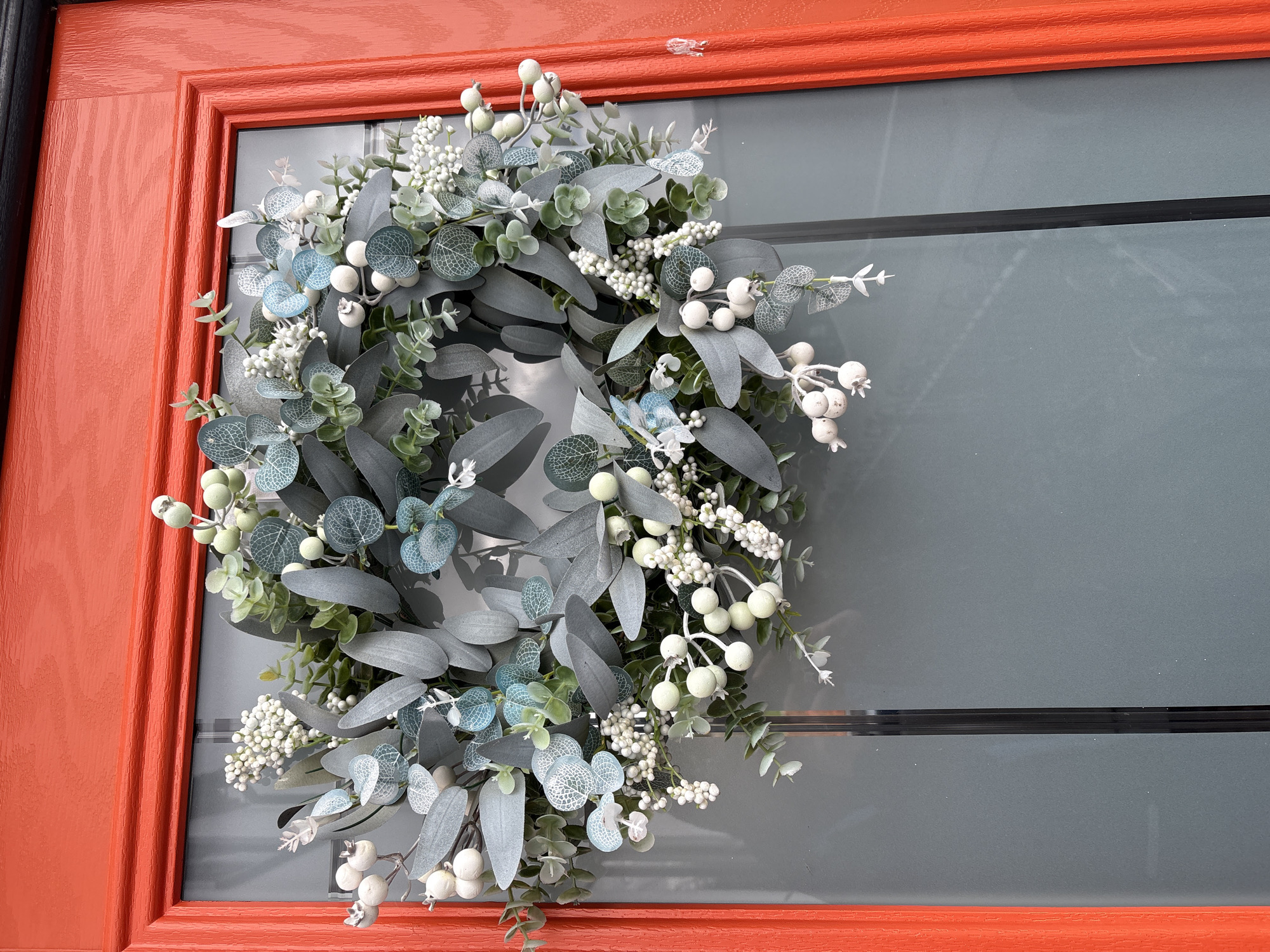 A close-up shot depicts a decorative wreath mounted on a glass-paned door with an orange frame