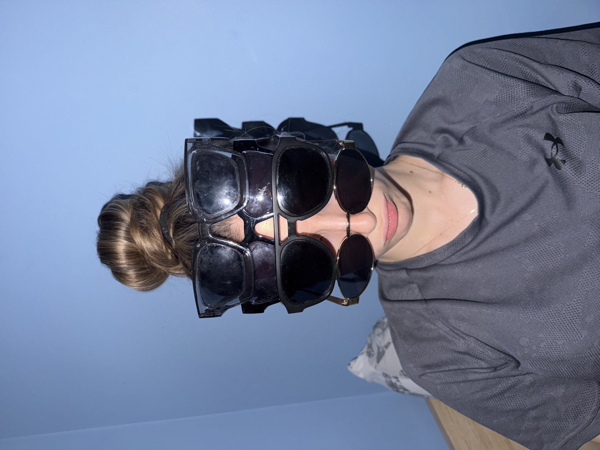 The image displays a head and upper torso shot of an individual inside a room. The person, with light brown hair styled in a bun, is facing the camera directly. Four pairs of sunglasses are stacked vertically on their face. The top pair features clear-grey rectangular frames, followed by a pair with black rectangular frames, then a pair with matte black rounded frames, and finally a pair with thin gold-colored oval frames resting over the eyes and nose. All sunglasses have dark lenses. The individual wears a dark grey, short-sleeved athletic shirt with a subtle textured pattern and an Under Armour logo on the left chest. A thin gold chain necklace with a small pendant is visible around the neck. The person's mouth is slightly pursed. The background consists primarily of a plain light blue wall. A portion of a white and grey patterned pillow is visible on the left, adjacent to a light-colored wooden surface. The image provides no discernible information regarding its specific location within Plovdiv, Bulgaria.